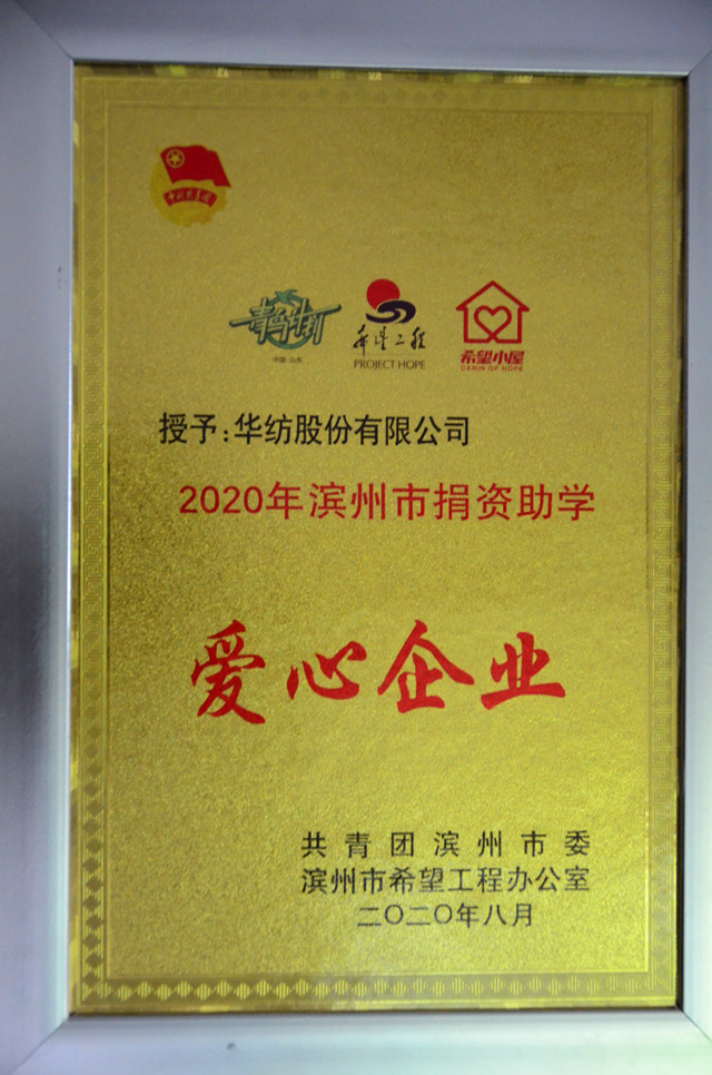 活動(dòng)現(xiàn)場(chǎng),公司被授予2020年濱州市捐資助學(xué)愛(ài)心企業(yè)。公司團(tuán)委積極響應(yīng)團(tuán)市委的倡議,組織開(kāi)展了“希望小屋”愛(ài)心募捐活動(dòng),各部室、各車間組織愛(ài)心募捐,各工會(huì)干部、團(tuán)支部書(shū)記踴躍帶頭,全公司廣大干部職工參與廣泛,充分體現(xiàn)出華紡人擔(dān)當(dāng)?shù)纳鐣?huì)責(zé)任精神。