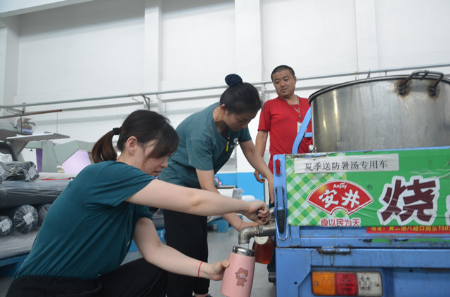 圖為6月20日公司向生產(chǎn)一線發(fā)送綠豆湯和西紅柿雞蛋湯的情形。