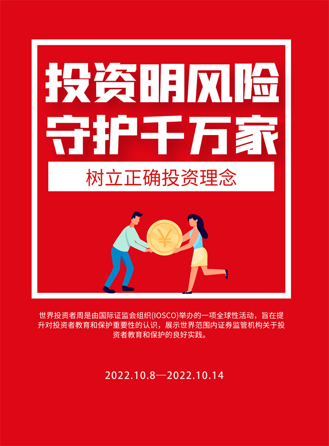 2022年“世界投資者周”將圍繞“投資明風(fēng)險(xiǎn),守護(hù)千萬家”主題,向投資者普及《期貨和衍生品法》、普及綠色金融、綠色投資理念,引導(dǎo)投資者閱讀上市公司定期報(bào)告、踐行以信息披露為核心的注冊(cè)制理念,向投資者傳播金融證券知識(shí),提示投資風(fēng)險(xiǎn),增強(qiáng)理性投資、價(jià)值投資、長(zhǎng)期投資、風(fēng)險(xiǎn)防范意識(shí),引導(dǎo)投資者樹立正確投資理念。