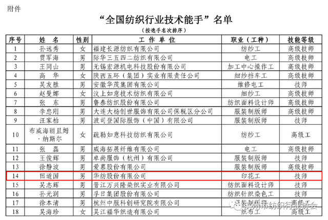 導(dǎo)讀:近日,中國紡織工業(yè)聯(lián)合會(huì)發(fā)布了授予在2023年全國紡織行業(yè)勞動(dòng)技能競賽中取得前18名的紡織企業(yè)員工為“全國紡織行業(yè)技術(shù)能手”榮譽(yù)稱號的決定,