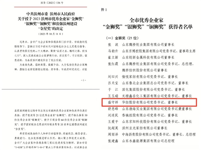 會(huì)上,對在品質(zhì)濱州建設(shè)過程中作出突出貢獻(xiàn)的優(yōu)秀企業(yè)家和先進(jìn)單位進(jìn)行了表彰頒獎(jiǎng),公司黨委書記、董事長盛守祥先生榮獲2023濱州市優(yōu)秀企業(yè)家“金獅獎(jiǎng)”。