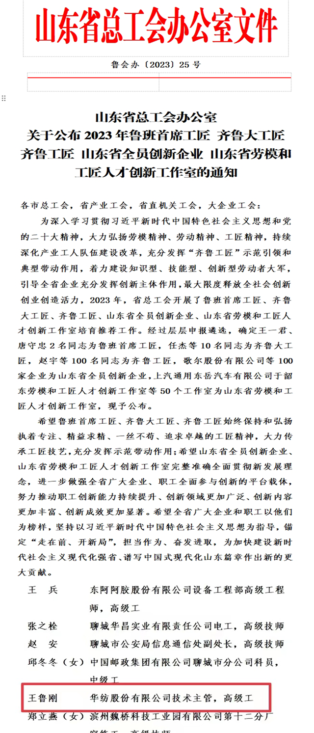 近日,省總工會下發(fā)通知,公布了多項獲獎名單,其中,公司面料車間技術主管、高級工王魯剛榮獲第六屆“齊魯工匠”稱號。這是王魯剛繼獲“濱州工匠”、山東省“最佳創(chuàng)新(效益)能手”、“全國紡織行業(yè)技術能手”后的又一榮譽。