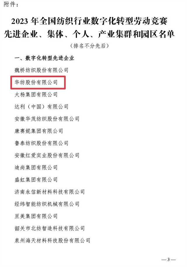 近日,中國紡織工業(yè)聯(lián)合會、中國財貿(mào)輕紡煙草工會全國委員會聯(lián)合發(fā)布了《關(guān)于2023年全國紡織行業(yè)數(shù)字化轉(zhuǎn)型勞動競賽結(jié)果的通報》,公司憑借2023年在數(shù)字化轉(zhuǎn)型方面的不斷探索與創(chuàng)新被評為“數(shù)字化轉(zhuǎn)型先進(jìn)企業(yè)”,公司信息互聯(lián)部被評為“數(shù)字化轉(zhuǎn)型先進(jìn)集體”,公司黨委書記、董事長盛守祥先生被評為“數(shù)字化轉(zhuǎn)型先進(jìn)個人”。