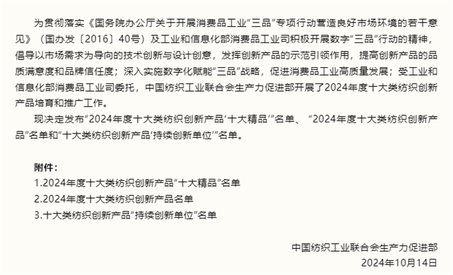 導(dǎo)讀:近日,中國紡織工業(yè)聯(lián)合會(huì)生產(chǎn)力促進(jìn)部發(fā)布了“2024年度十大類紡織創(chuàng)新產(chǎn)品‘十大精品’”名單、“2024年度十大類紡織創(chuàng)新產(chǎn)品”名單和“十大類紡織創(chuàng)新產(chǎn)品‘持續(xù)創(chuàng)新單位’”名