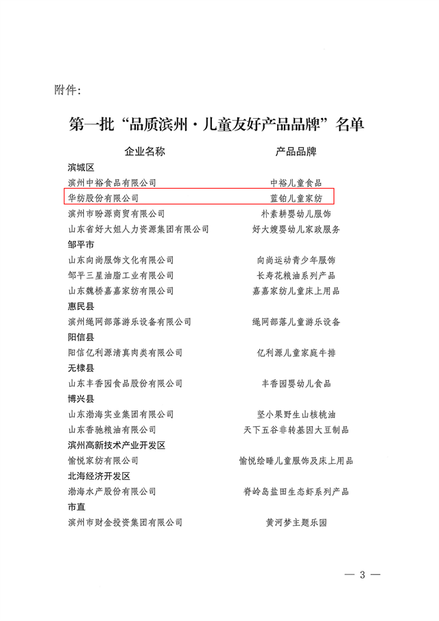 近日,市發(fā)展改革委、市婦聯(lián)、市市場監(jiān)管局聯(lián)合發(fā)布第一批“品質(zhì)濱州·兒童友好產(chǎn)品品牌”名單,公司藍鉑兒童家紡憑借卓越的品質(zhì)與貼心的設計成功入選。