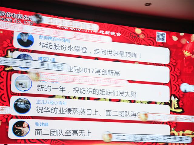 今年華紡“春晚”與往年不同的一個亮點在于,在演出現(xiàn)場加入了“微信彈幕”,現(xiàn)場通過微信關(guān)注的觀眾中,有26名觀眾在三次自動搖獎成為幸運觀眾而獲得了獎勵。演出結(jié)束后,公司總經(jīng)理閆英山等公司領(lǐng)導(dǎo),與參加演出的員工合影留念。