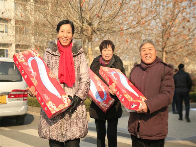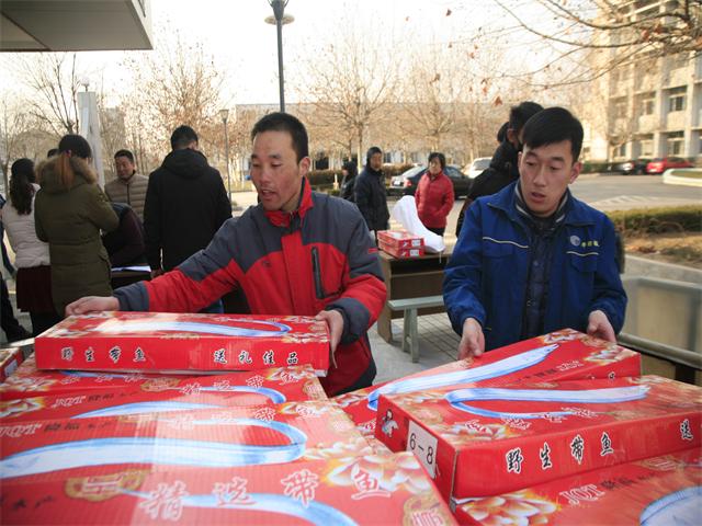 圖為員工領(lǐng)到春節(jié)慰問品時(shí)的情形。