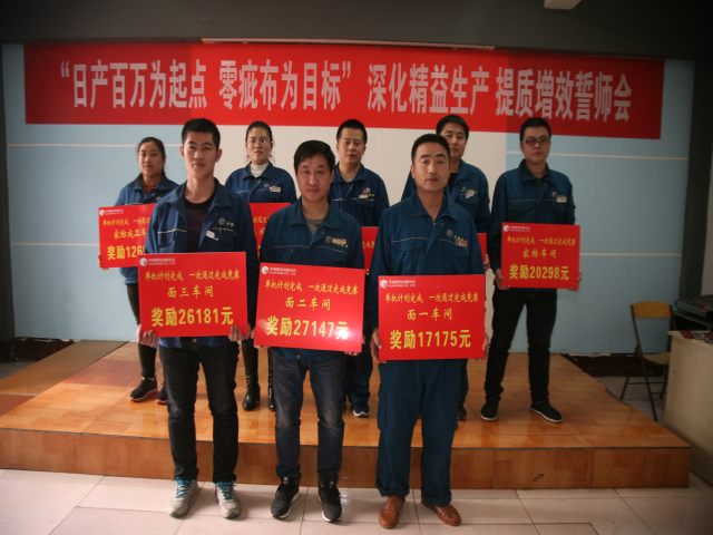 3月3日,公司召開主題為“日產(chǎn)百萬為起點、零疵布為目標”深化精益生產(chǎn)、提質(zhì)增效誓師大會,公司高管、分公司經(jīng)理、業(yè)務(wù)經(jīng)理、車間主任、職能部室主任、輪班長、技術(shù)員和機組長代表近200人參加會議。會上,公司黨委書記、董事長王力民為今年1-2月份各車間“單機計劃完成率”、“一次通過率”競賽優(yōu)秀機臺代表頒發(fā)獎勵牌,并圍繞進一步強化精益生產(chǎn)做重要講話;總經(jīng)理閆英山對精益生產(chǎn)執(zhí)行情況,特別是今年1-2月份情況進行了深入分析總結(jié),提出了新的任務(wù)與目標。