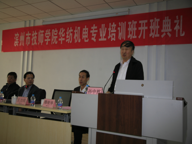 4月3日,公司與濱州市技師學(xué)院在公司工程技術(shù)研究院舉行“華紡機電專業(yè)培訓(xùn)班開班典禮”。開班典禮在莊嚴的國歌聲中開始,濱州市技師學(xué)院黨委副書記、院長丁愛軍,黨委委員、副院長穆俊華,公司黨委書記、董事長王力民,總工程師羅維新在主席臺就坐,并為學(xué)員代表授書,丁愛軍和王力民分別發(fā)表講話。