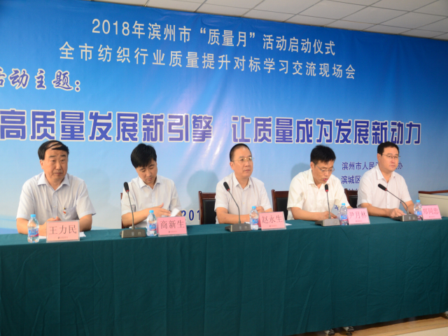 9月5日,2018年濱州市“質(zhì)量月”活動啟動儀式暨全市紡織行業(yè)質(zhì)量提升對標(biāo)學(xué)習(xí)交流現(xiàn)場會在公司科技產(chǎn)業(yè)園舉行,會議由市政府秘書長尹月林主持,副市長、公安局長趙永生,市質(zhì)監(jiān)局黨委書記商新生,濱城區(qū)副區(qū)長鄭同忠,公司黨委書記、董事長王力民出席啟動儀式。